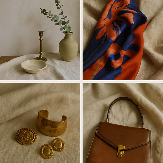 A curated selection of vintage home décor featuring decorative objects, tableware, art, and accents, chosen for their materials, craftsmanship, era, and timeless presence.